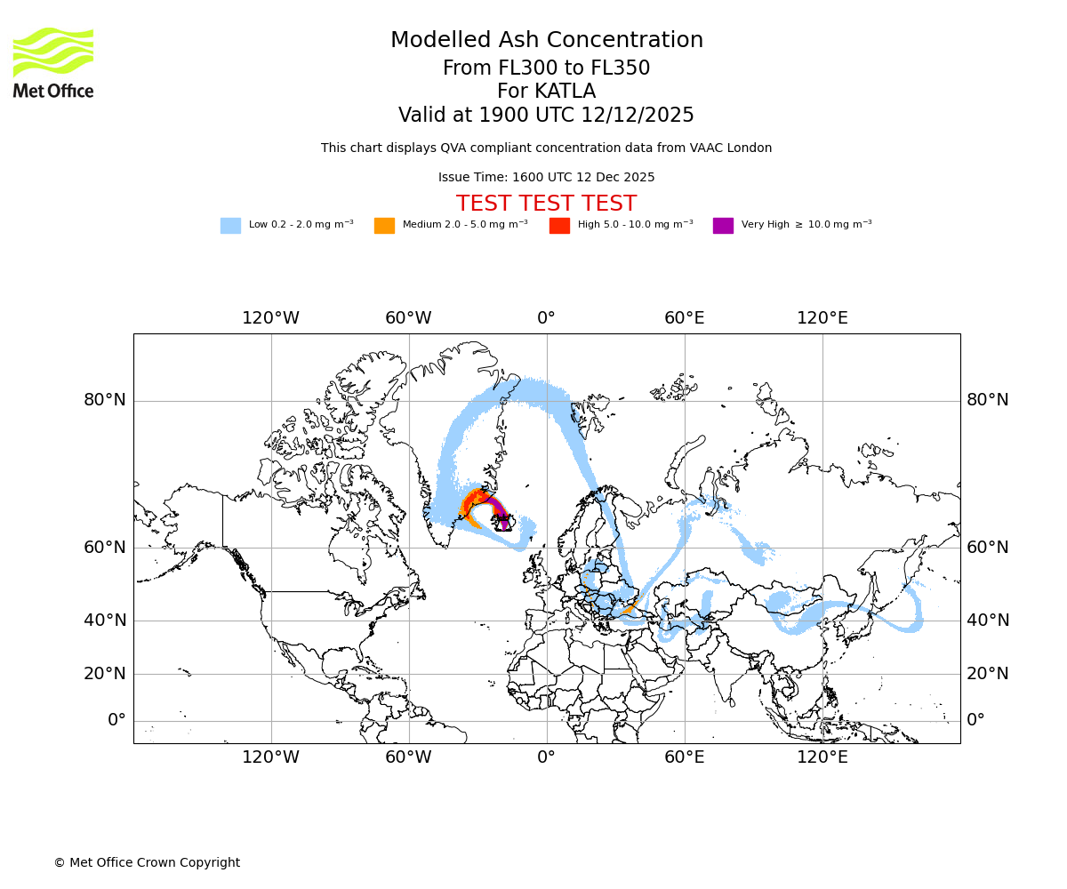 Modelled ash concentration from 300 to 350 for KATLA. Valid at 1600 UTC 12/12/2025