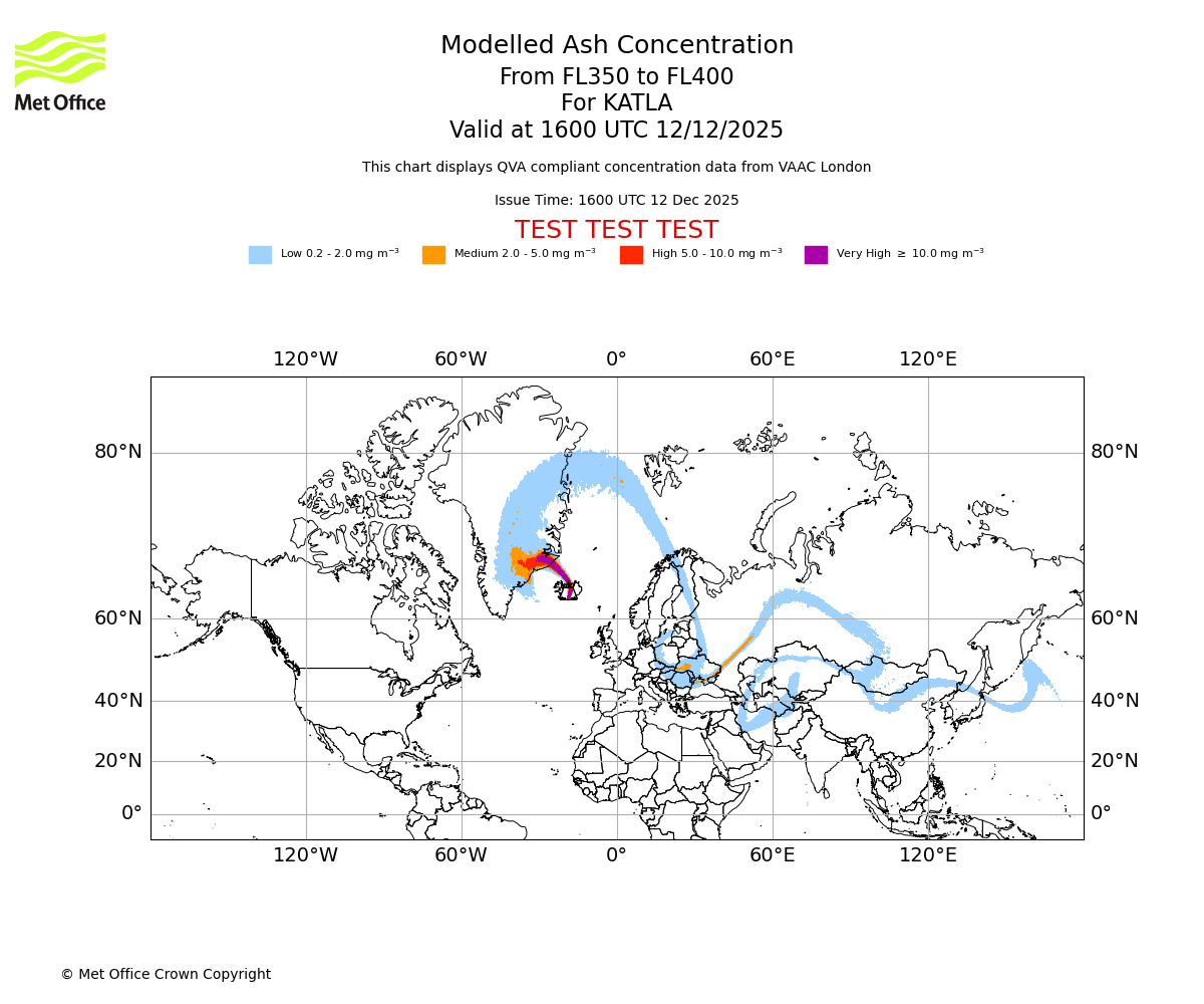 Modelled ash concentration from 000 to 200 for KATLA. Valid at 1600 UTC 12/12/2025