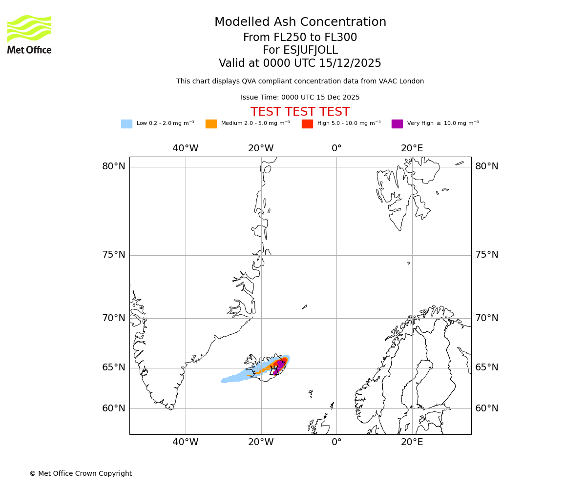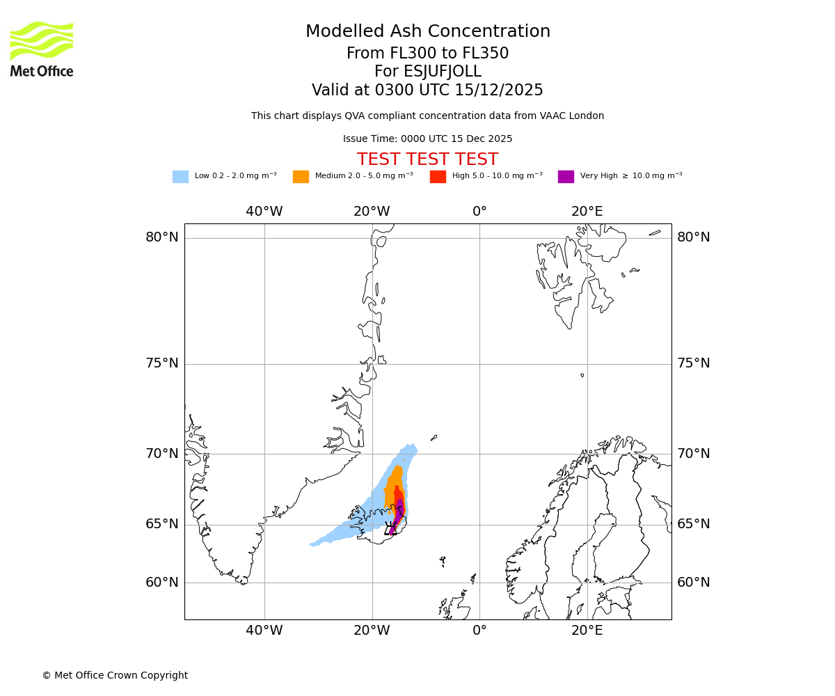 Modelled ash concentration from 300 to 350 for ESJUFJOLL. Valid at 0000 UTC 15/12/2025