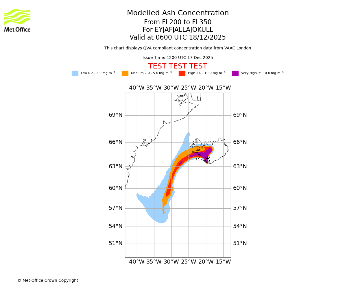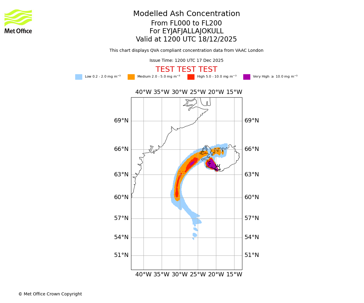 Modelled ash concentration from 000 to 200 for EYJAFJALLAJOKULL. Valid at 0600 UTC 18/12/2025