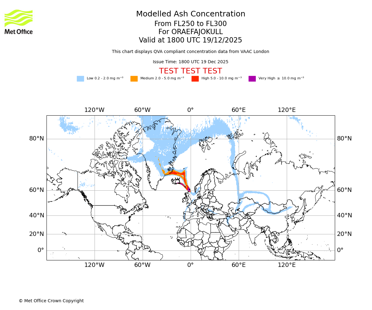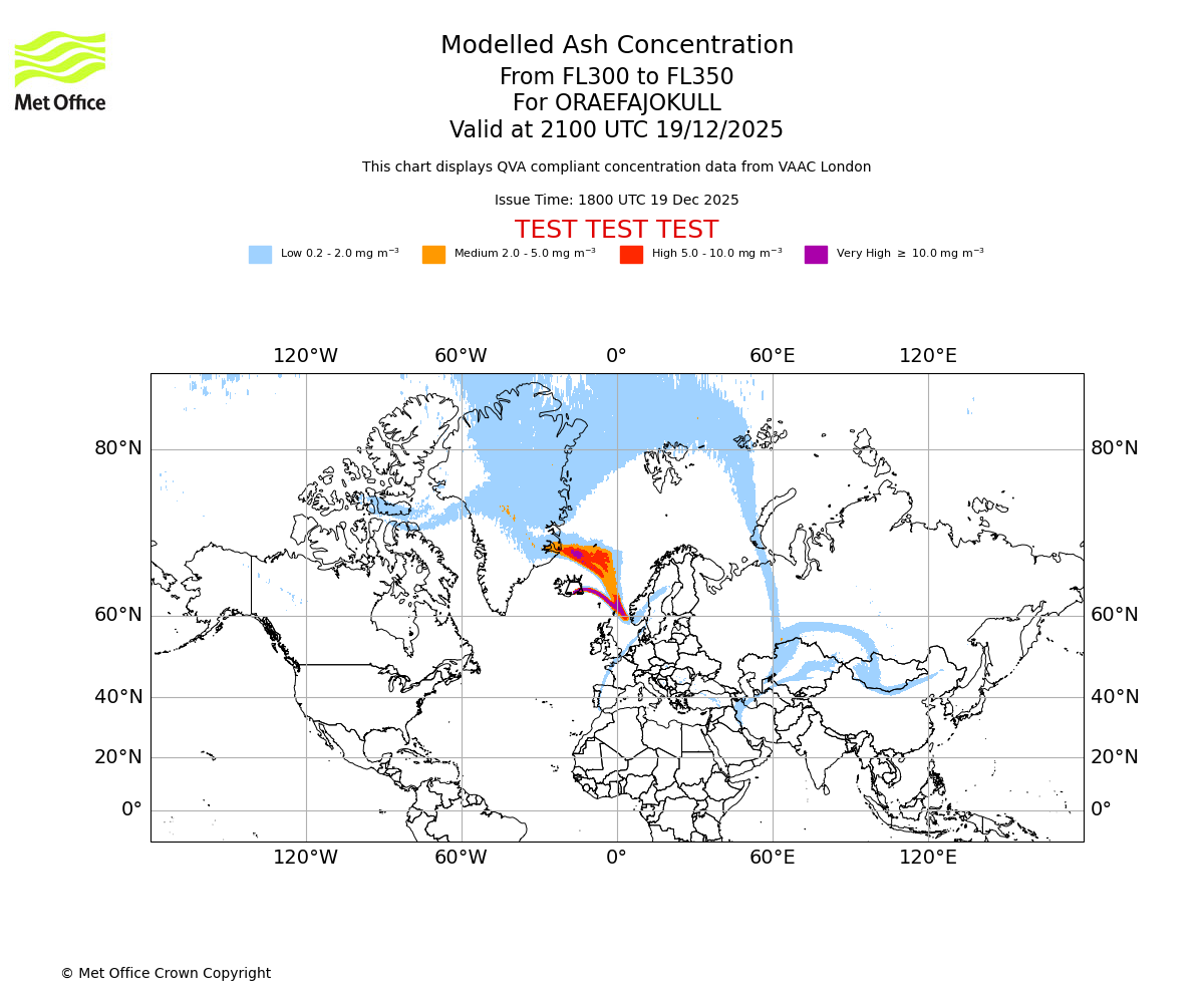 Modelled ash concentration from 300 to 350 for ORAEFAJOKULL. Valid at 1800 UTC 19/12/2025