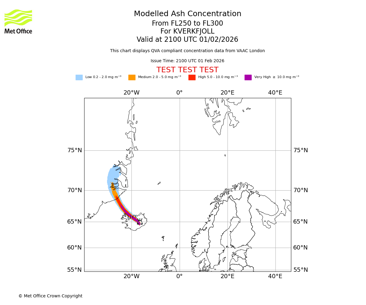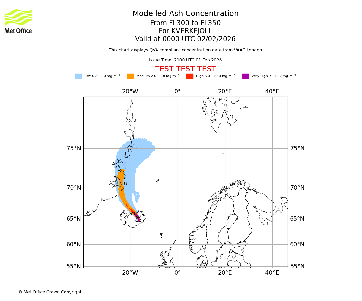 Modelled ash concentration from 300 to 350 for KVERKFJOLL. Valid at 2100 UTC 01/02/2026