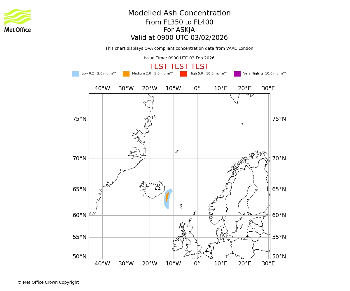 Modelled ash concentration from 300 to 350 for ASKJA. Valid at 0900 UTC 03/02/2026