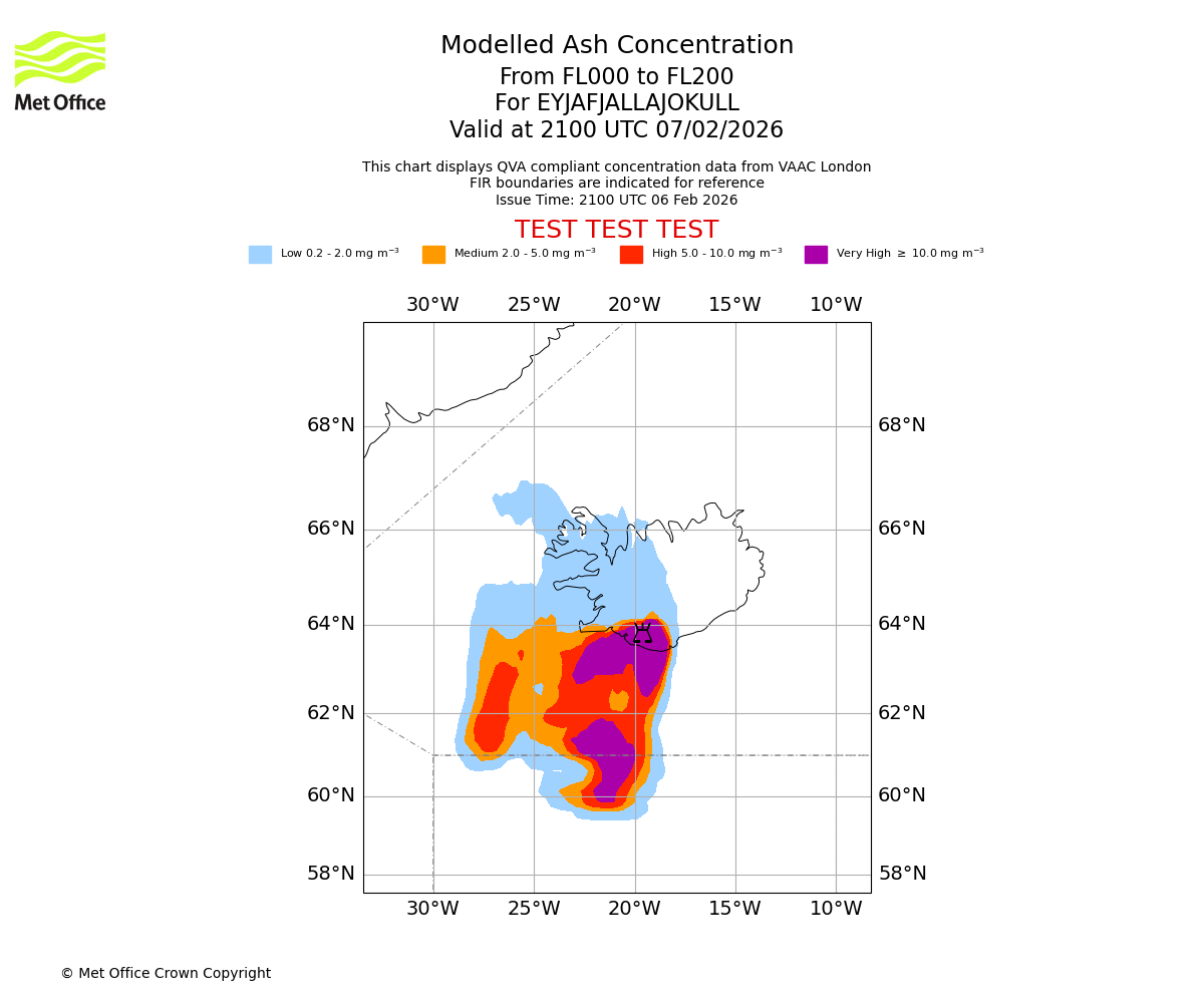Modelled ash concentration from 000 to 200 for EYJAFJALLAJOKULL. Valid at 1500 UTC 07/02/2026