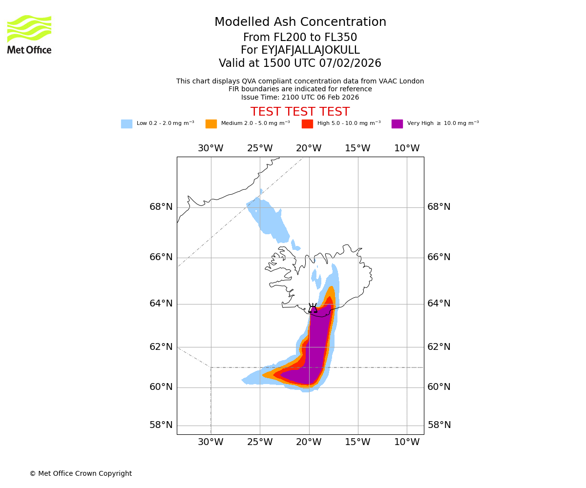 Modelled ash concentration from 300 to 350 for EYJAFJALLAJOKULL. Valid at 2100 UTC 06/02/2026