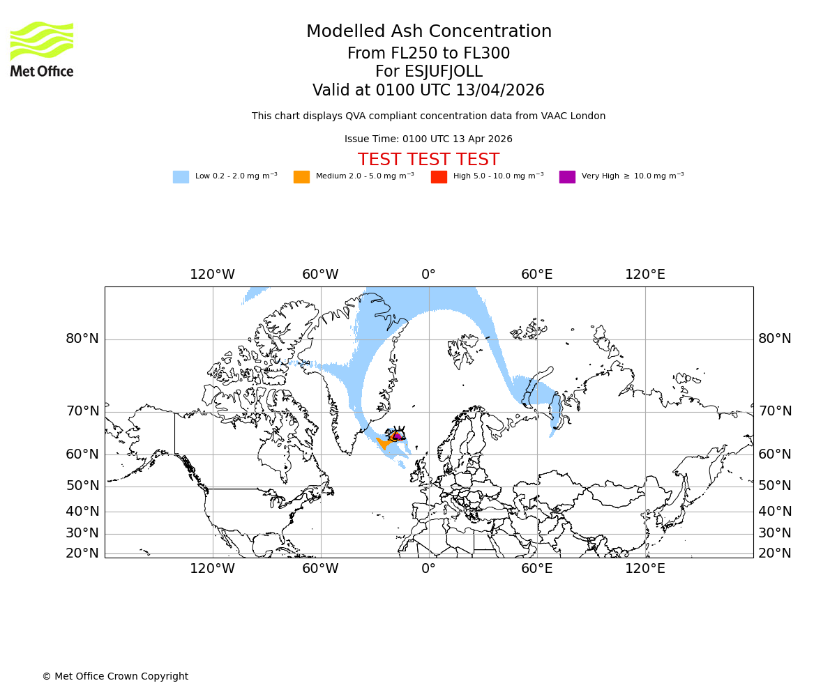 Quantitative Volcanic Ash charts (QVA) are produced in accordance with International Civil Aviation Organization (ICAO) Annex 3 requirements and are provided as well as the London Volcanic Ash Advisory Graphics (VAG) and Advisories (VAA). The lowest QVA threshold (0.2 mg/m³) matches to the areas depicted in the VAA and VAG. Both expected ash concentration and probabilistic forecast information is provided in the chart viewer below for eruptions occurring in the London Volcanic Ash Advisory Centre (VAAC) area of responsibility.