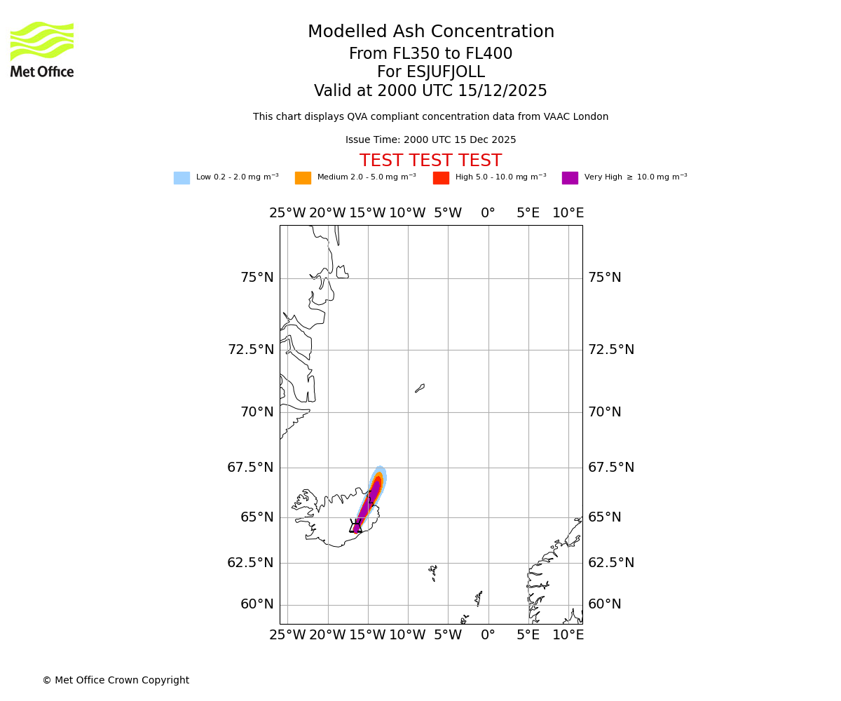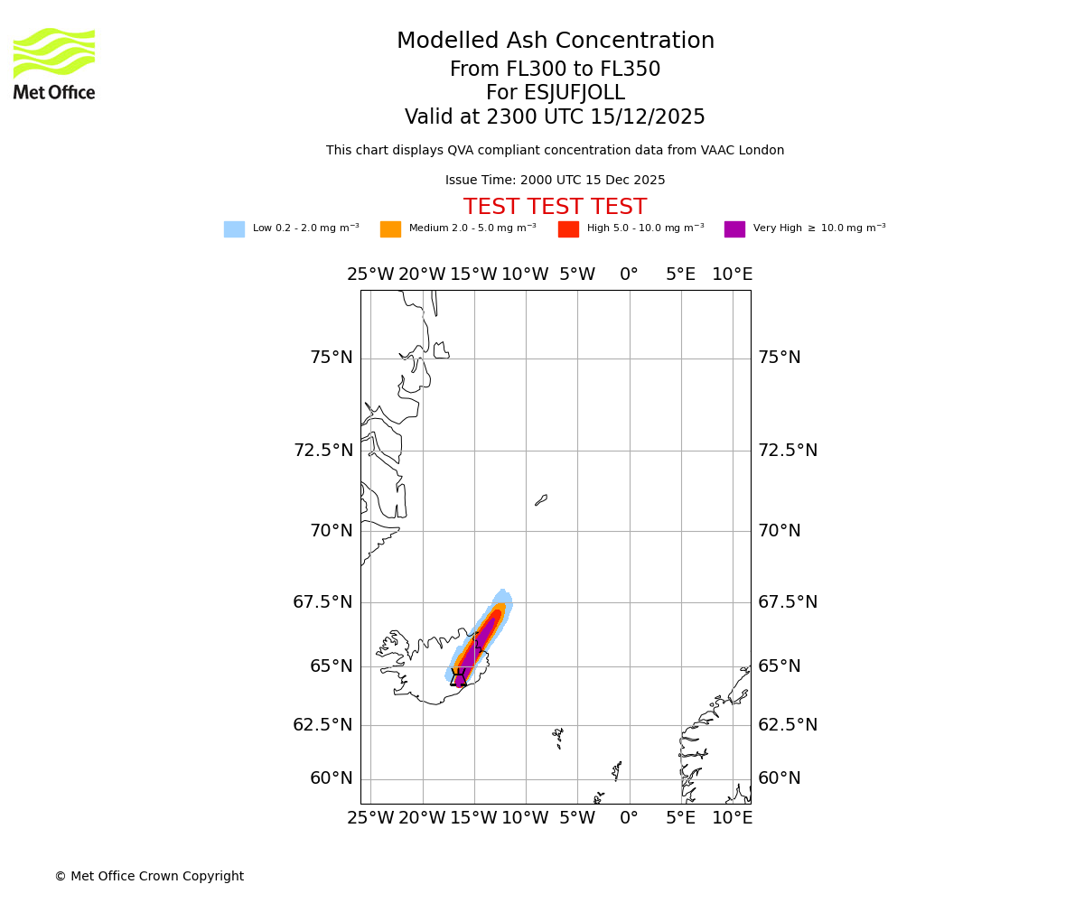 Modelled ash concentration from 300 to 350 for ESJUFJOLL. Valid at 2000 UTC 15/12/2025