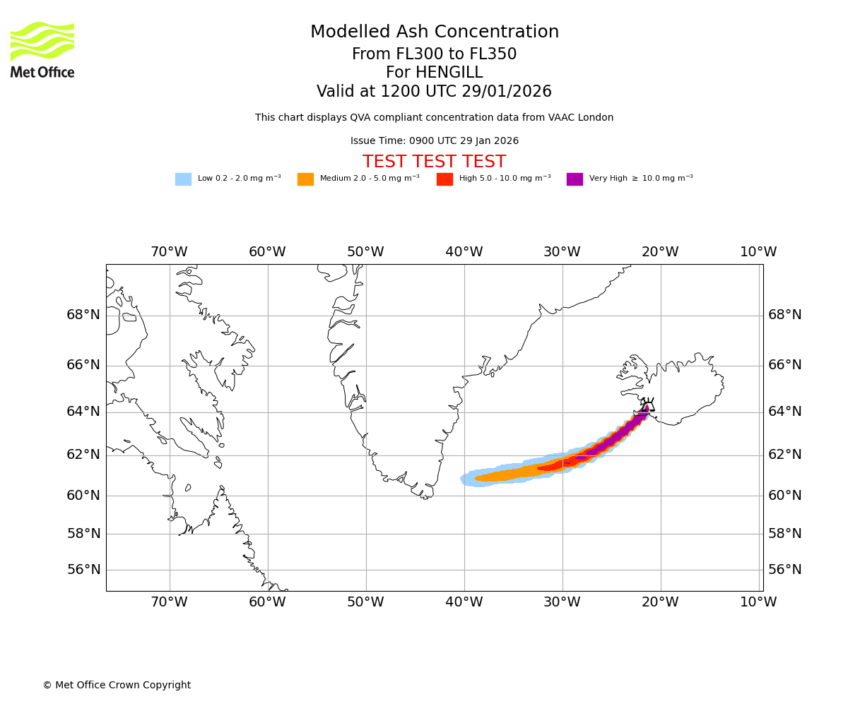 Modelled ash concentration from 300 to 350 for HENGILL. Valid at 0900 UTC 29/01/2026
