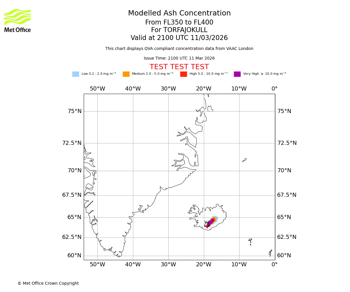 Modelled ash concentration from 300 to 350 for TORFAJOKULL. Valid at 2100 UTC 11/03/2026