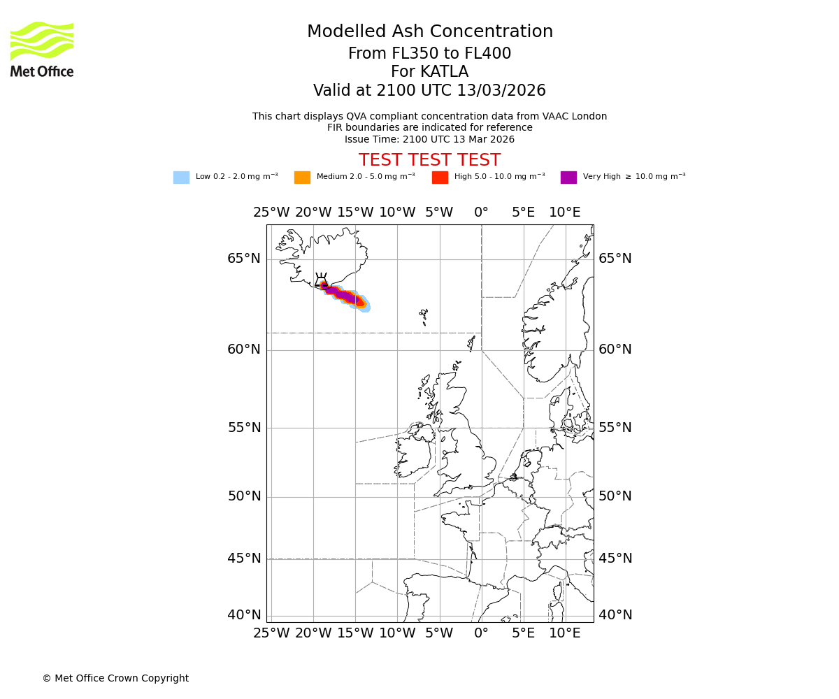 Modelled ash concentration from 300 to 350 for KATLA. Valid at 2100 UTC 13/03/2026