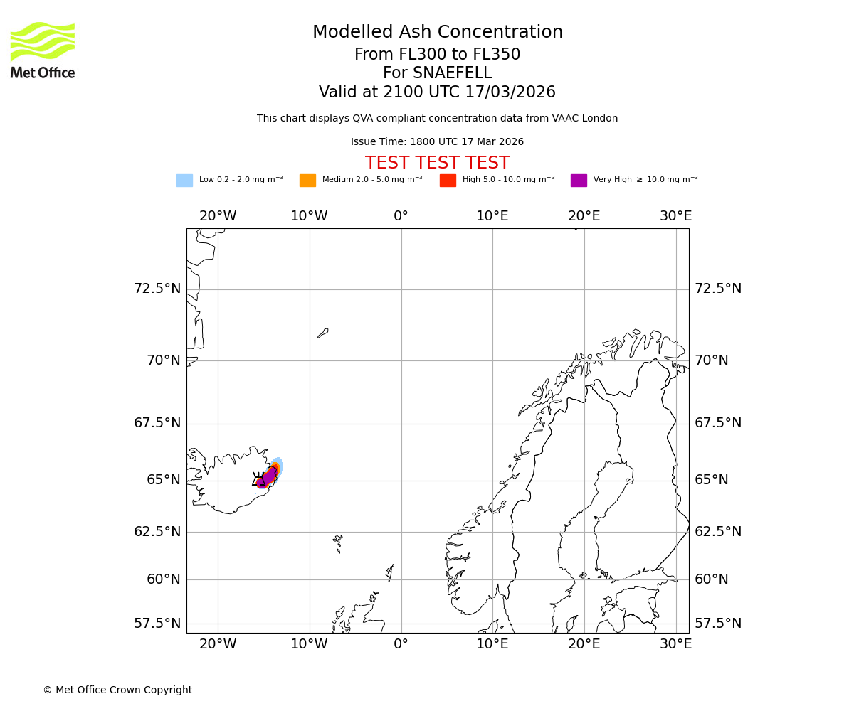 Modelled ash concentration from 300 to 350 for SNAEFELL. Valid at 1800 UTC 17/03/2026