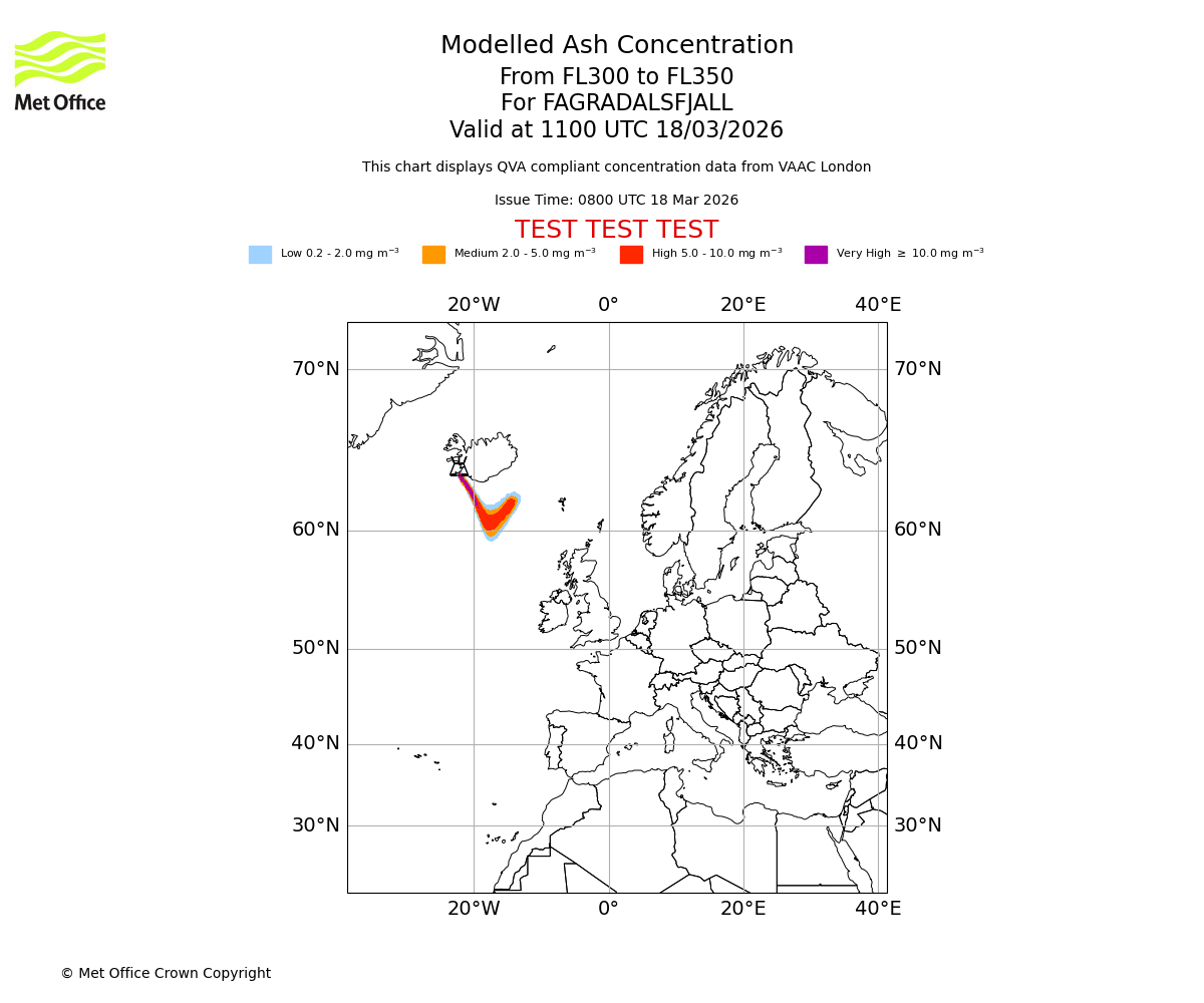 Modelled ash concentration from 300 to 350 for FAGRADALSFJALL. Valid at 0800 UTC 18/03/2026