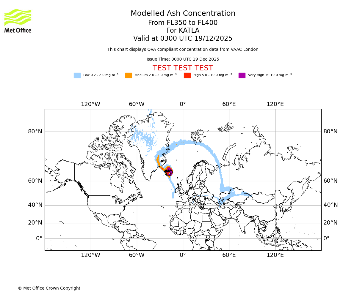 Modelled ash concentration from 350 to 400 for KATLA. Valid at 0000 UTC 19/12/2025
