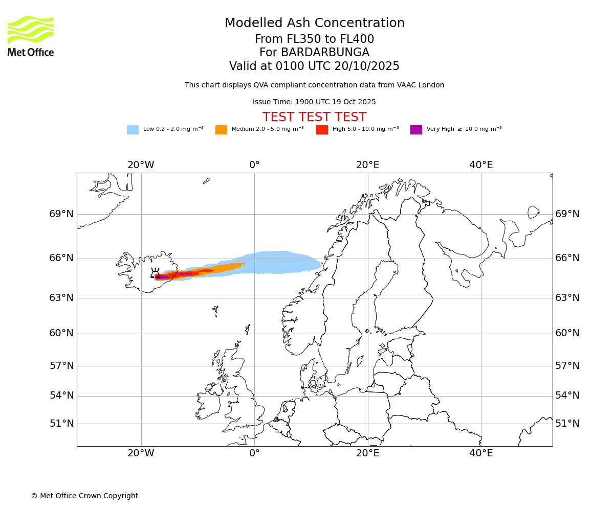 Modelled ash concentration from 350 to 400 for BARDARBUNGA. Valid at 2200 UTC 19/10/2025