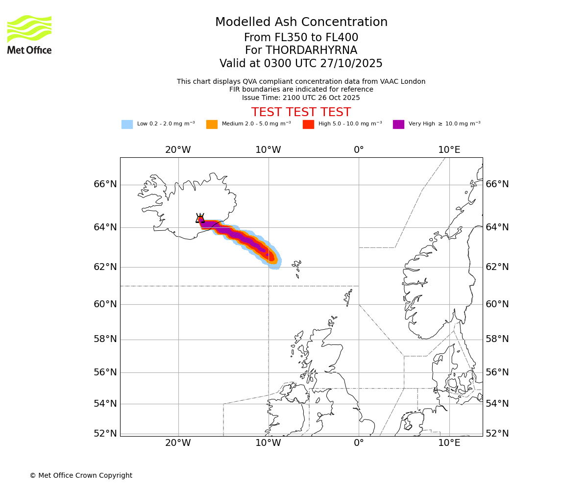 Modelled ash concentration from 350 to 400 for THORDARHYRNA. Valid at 0000 UTC 27/10/2025