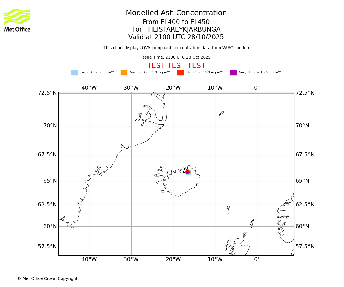 Modelled ash concentration from 350 to 400 for THEISTAREYKJARBUNGA. Valid at 2100 UTC 28/10/2025