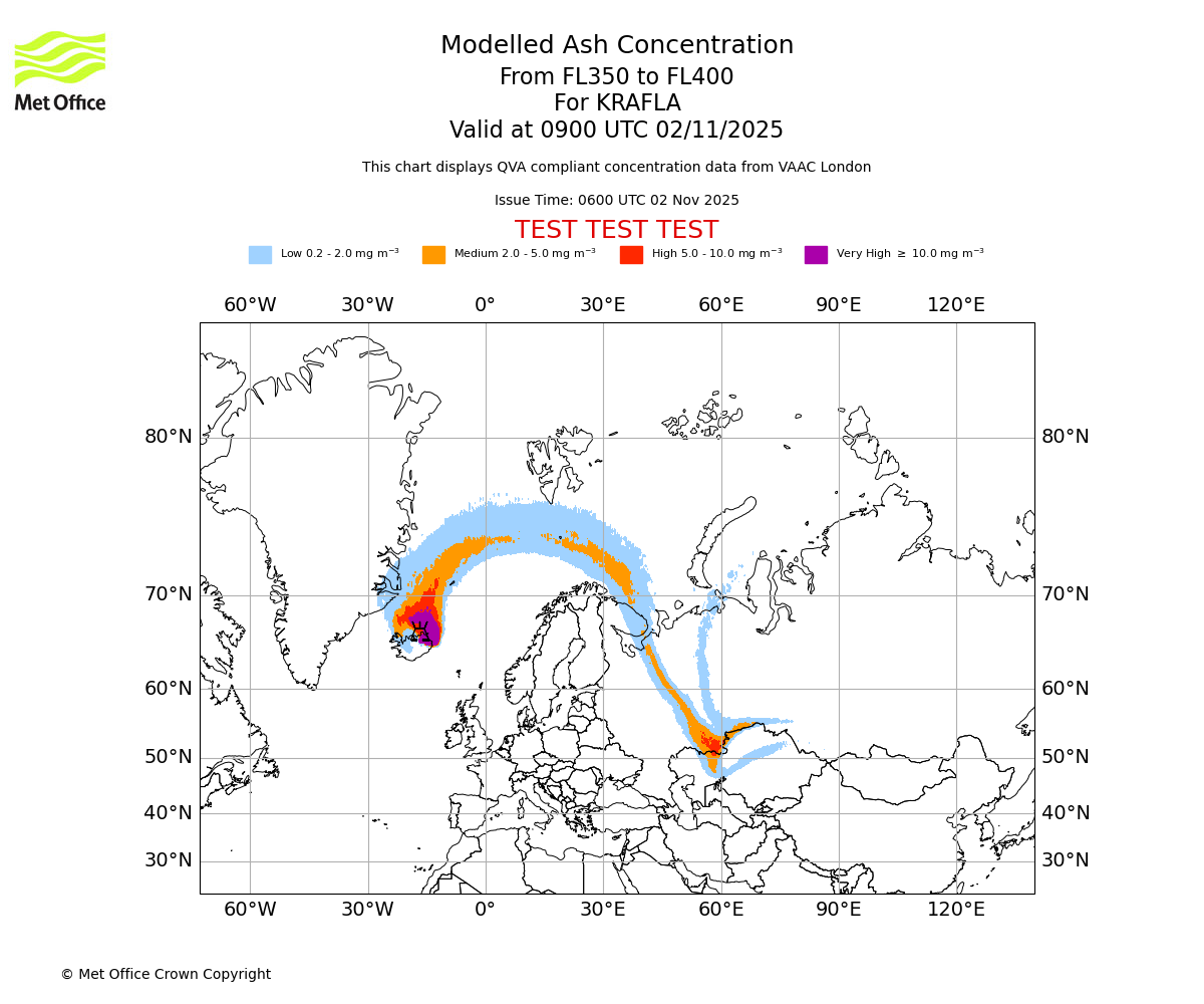 In accordance with ICAO Annex 3, Amendment 82 VAAC London will provide operational QVA forecasts from 27 November 2025 and these will be made available via a VAAC London QVA API information service. These charts are currently provided for test and evaluation purposes (not for operational use) until the introduction of the operational service.