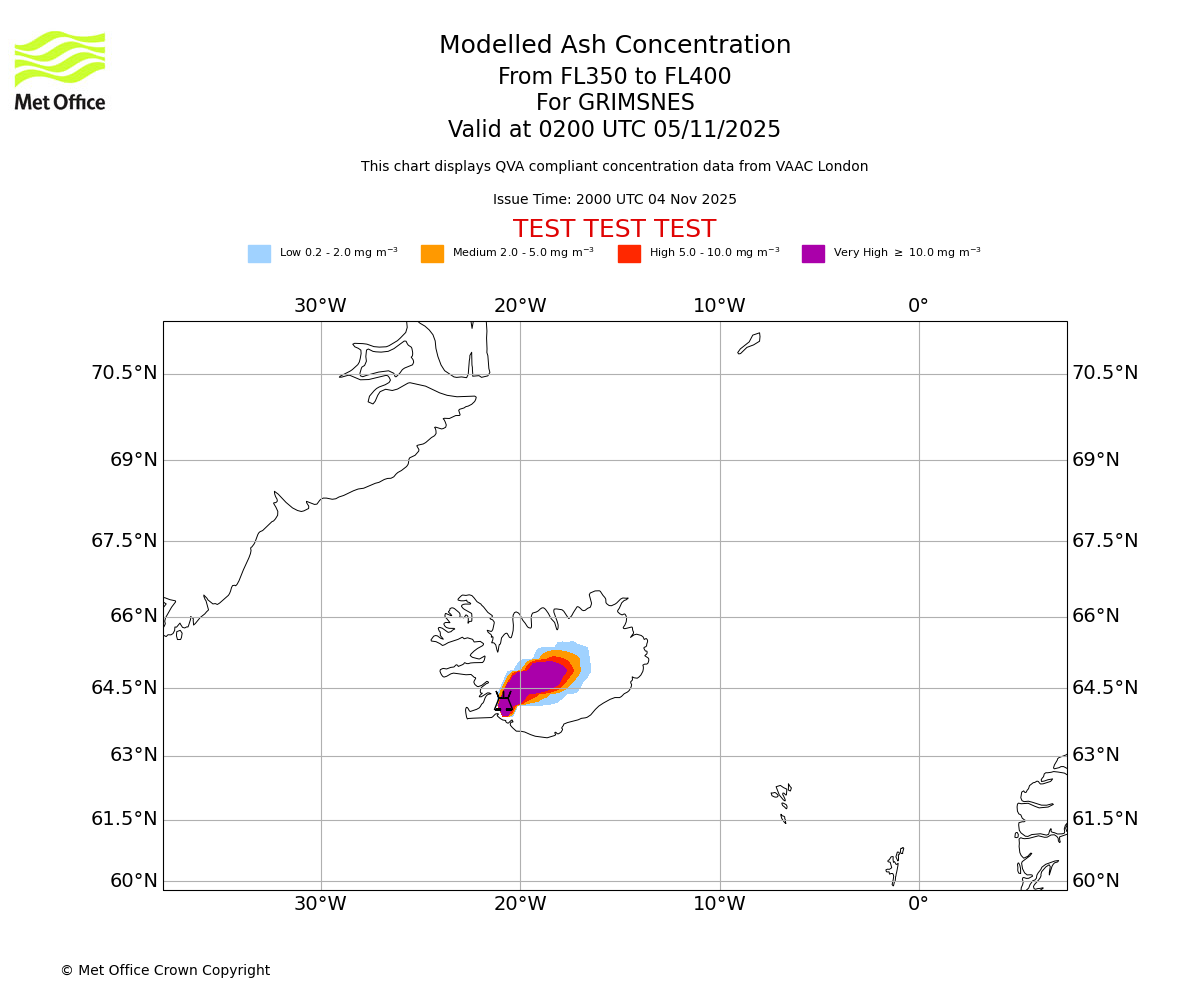 In accordance with ICAO Annex 3, Amendment 82 VAAC London will provide operational QVA forecasts from 27 November 2025 and these will be made available via a VAAC London QVA API information service. These charts are currently provided for test and evaluation purposes (not for operational use) until the introduction of the operational service.