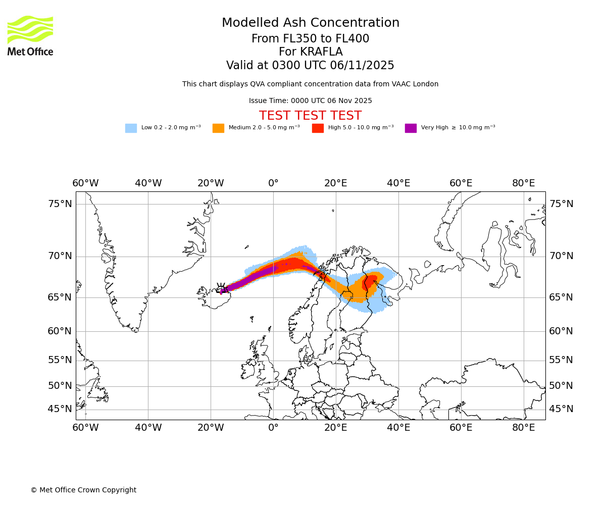 In accordance with ICAO Annex 3, Amendment 82 VAAC London will provide operational QVA forecasts from 27 November 2025 and these will be made available via a VAAC London QVA API information service. These charts are currently provided for test and evaluation purposes (not for operational use) until the introduction of the operational service.
