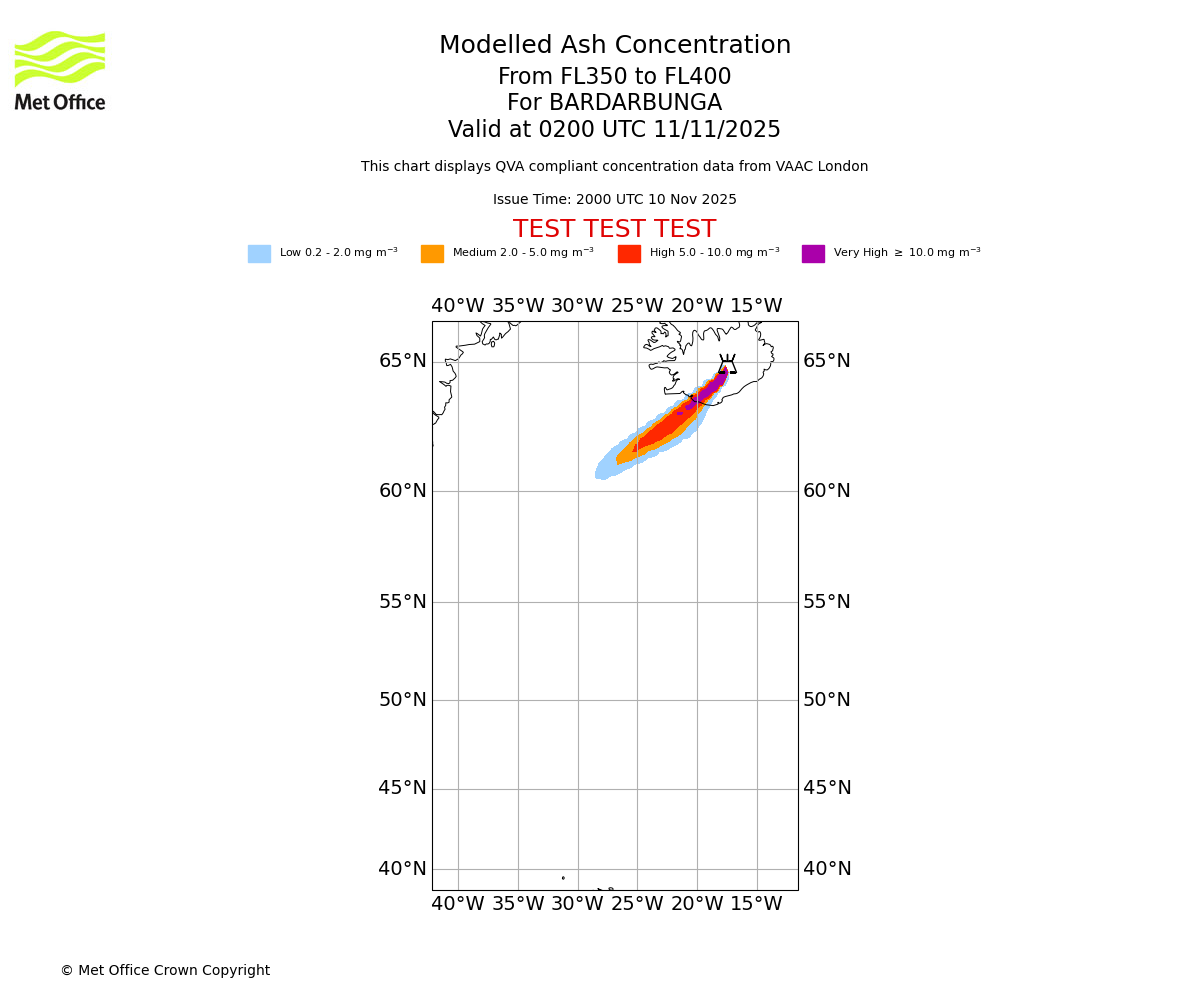 Modelled ash concentration from 350 to 400 for BARDARBUNGA. Valid at 2300 UTC 10/11/2025
