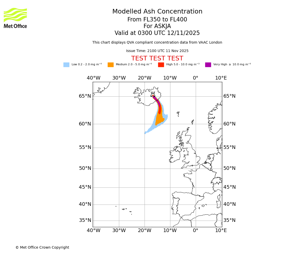 Modelled ash concentration from 350 to 400 for ASKJA. Valid at 0000 UTC 12/11/2025