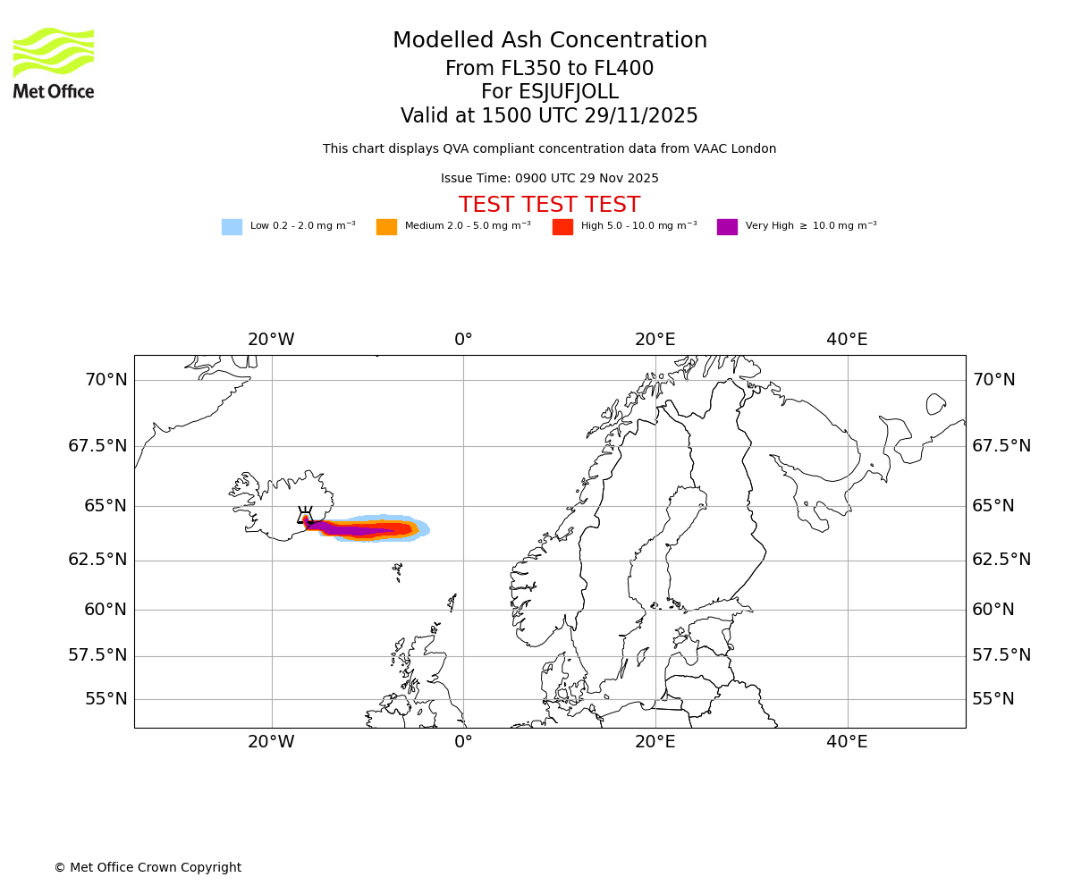 Modelled ash concentration from 350 to 400 for ESJUFJOLL. Valid at 1200 UTC 29/11/2025