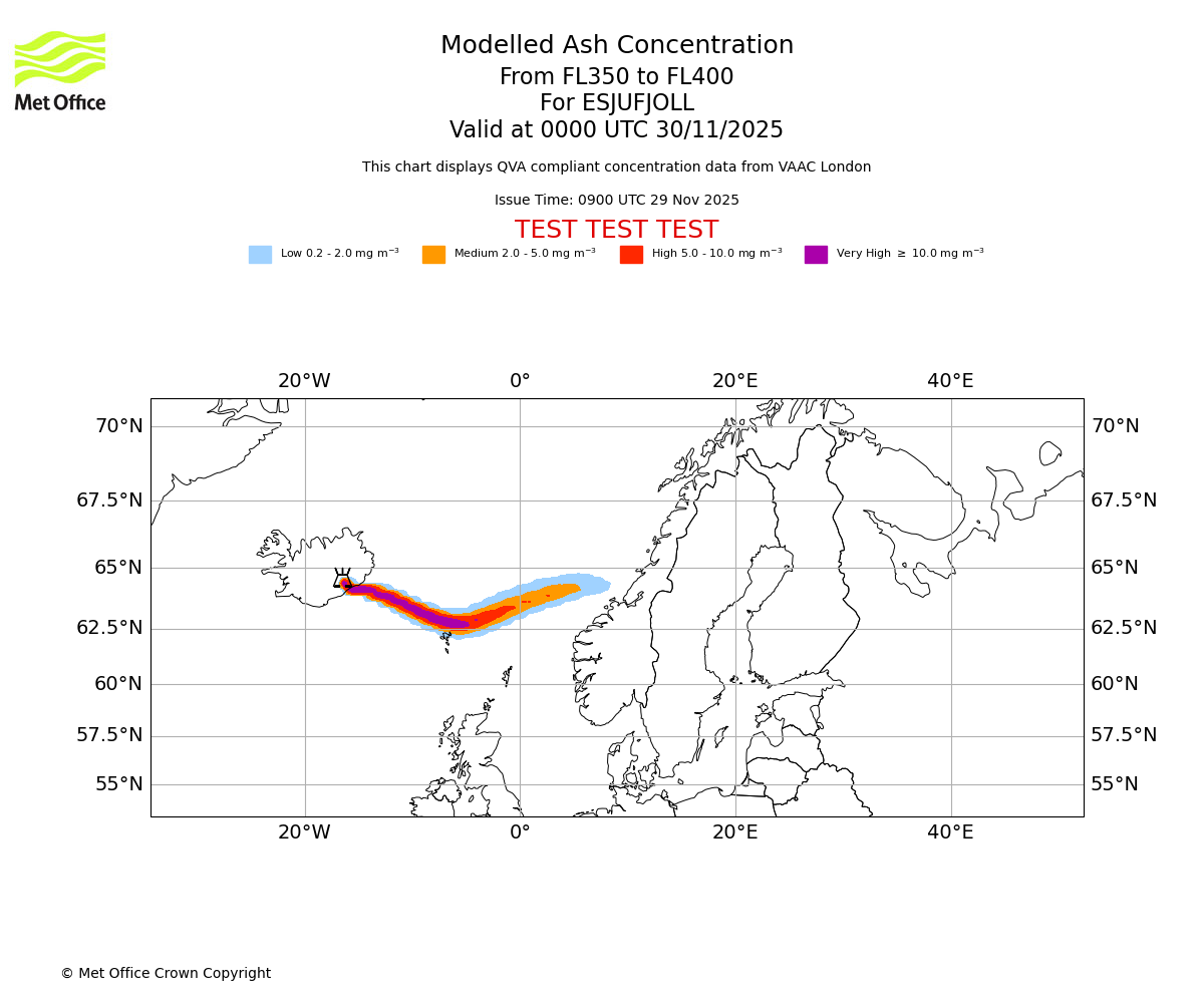 Modelled ash concentration from 350 to 400 for ESJUFJOLL. Valid at 2100 UTC 29/11/2025