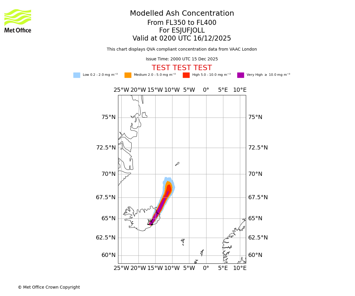 Modelled ash concentration from 350 to 400 for ESJUFJOLL. Valid at 2300 UTC 15/12/2025