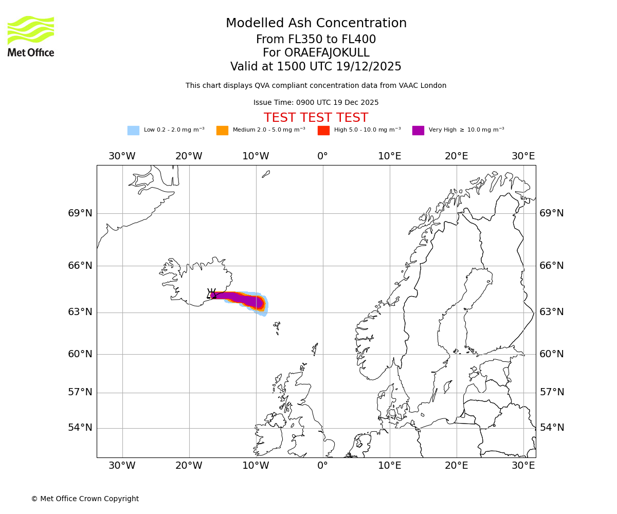 Modelled ash concentration from 350 to 400 for ORAEFAJOKULL. Valid at 1200 UTC 19/12/2025