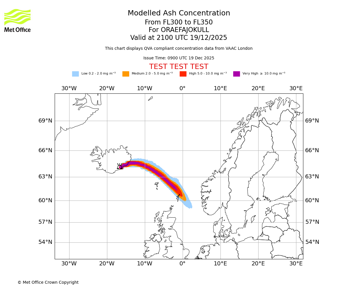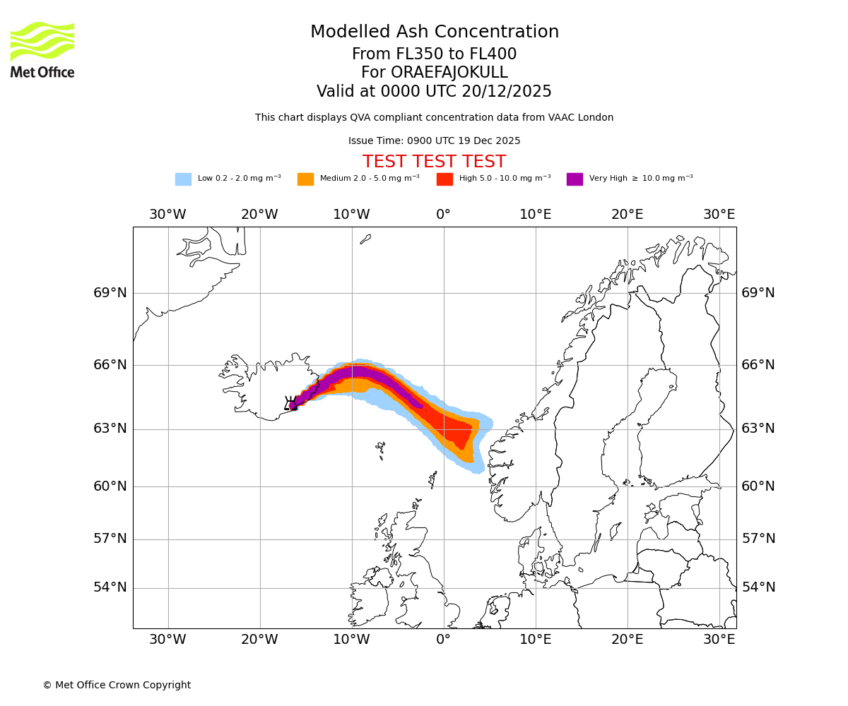 Modelled ash concentration from 350 to 400 for ORAEFAJOKULL. Valid at 2100 UTC 19/12/2025