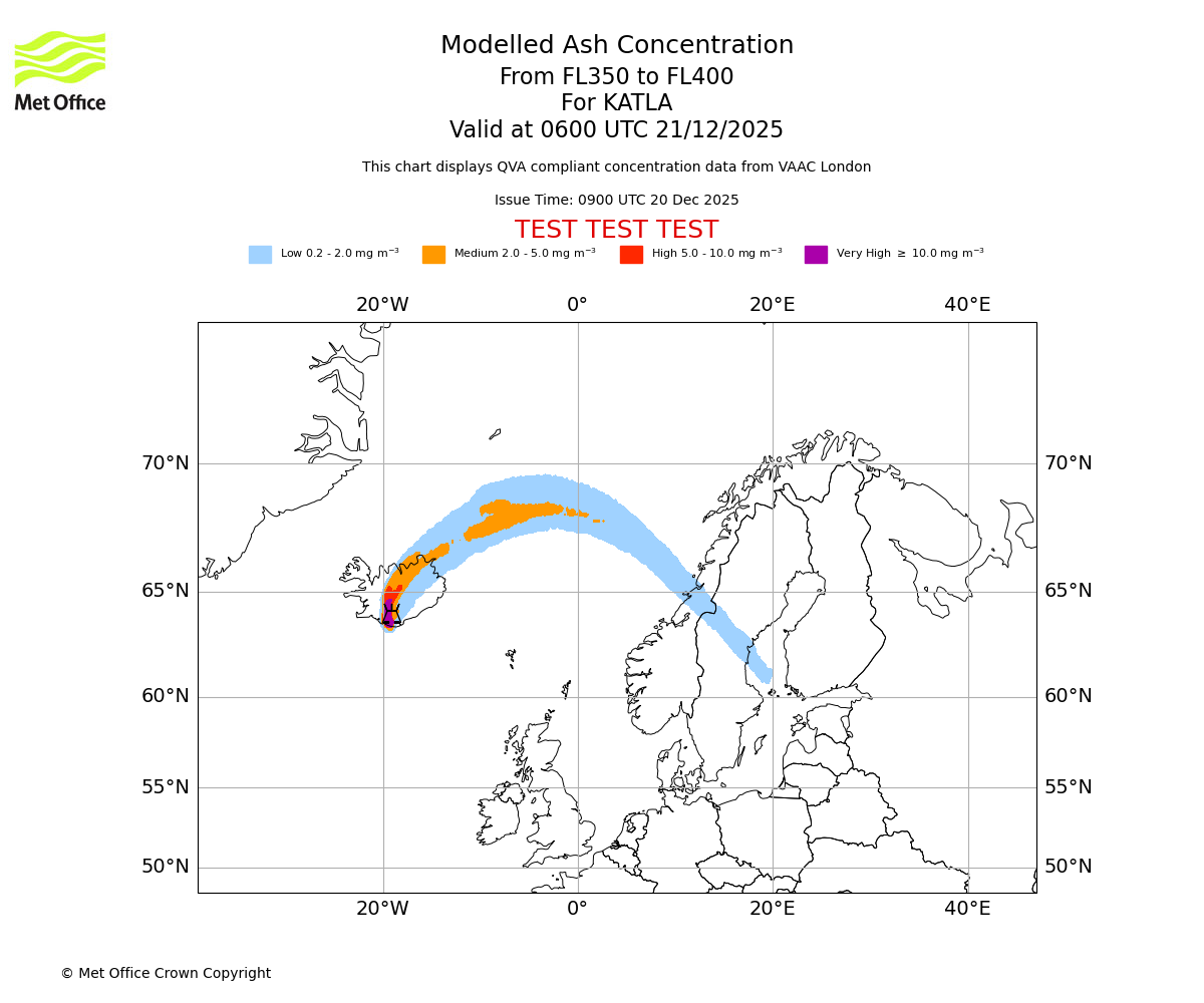 Modelled ash concentration from 350 to 400 for KATLA. Valid at 0300 UTC 21/12/2025