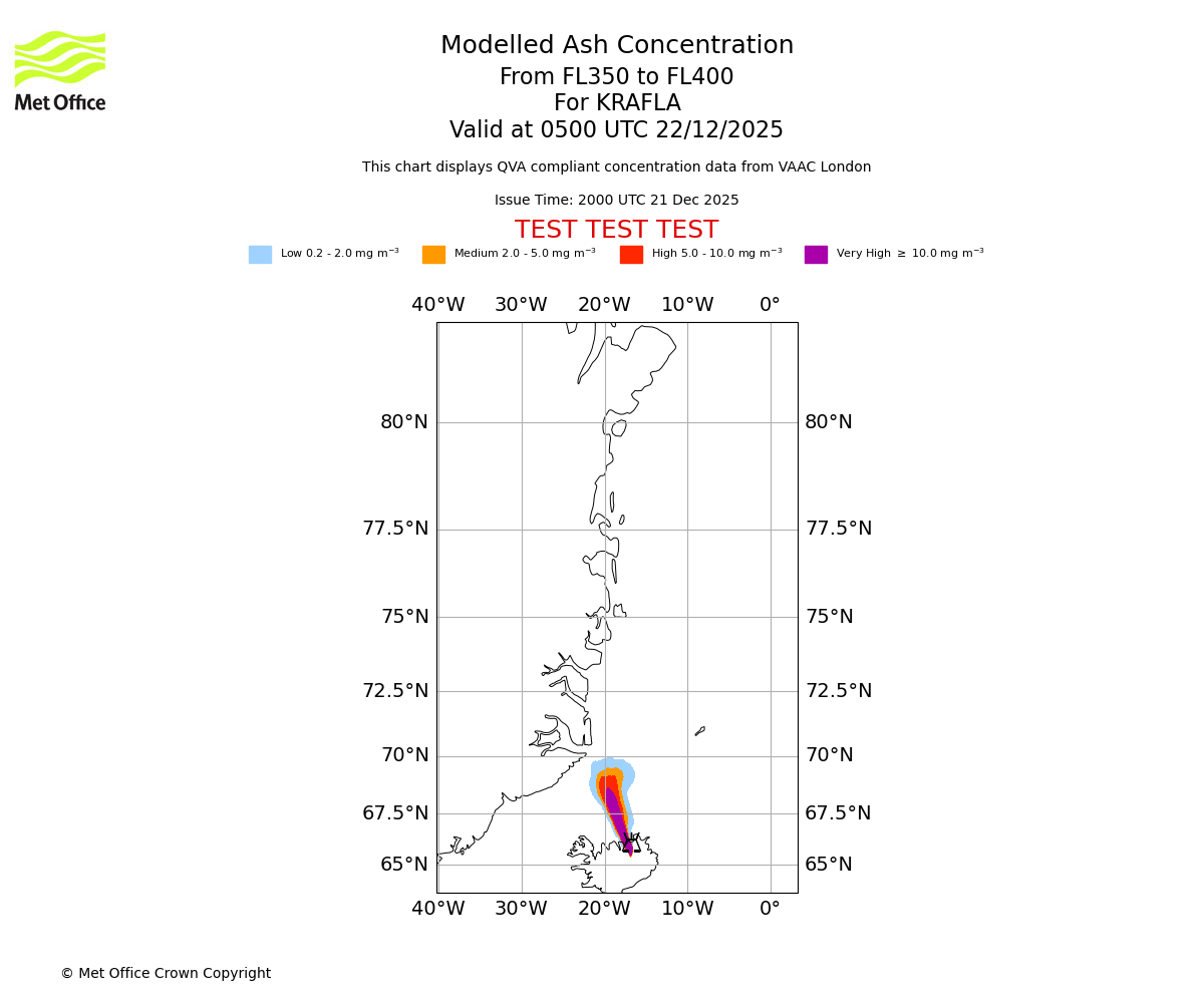 Modelled ash concentration from 350 to 400 for KRAFLA. Valid at 0200 UTC 22/12/2025