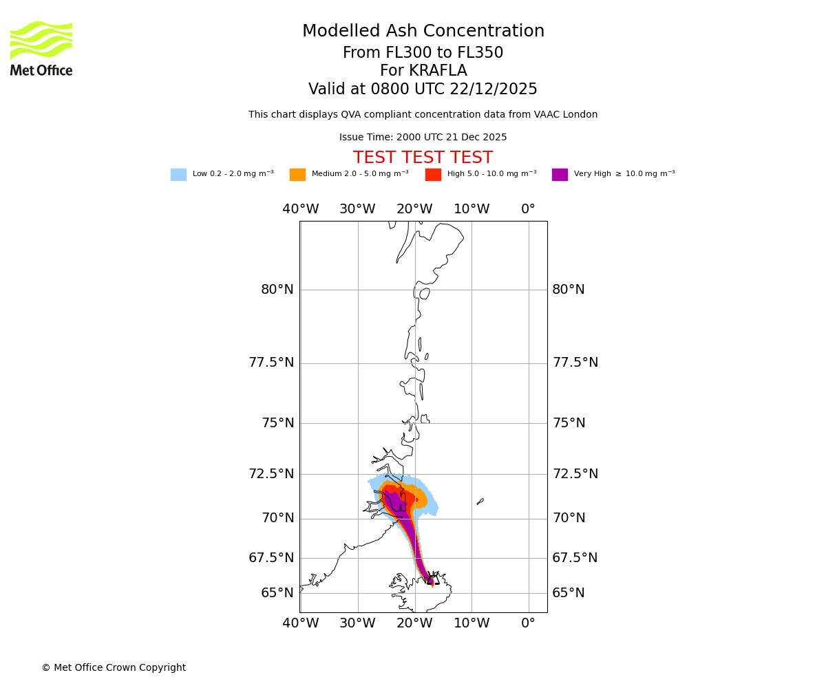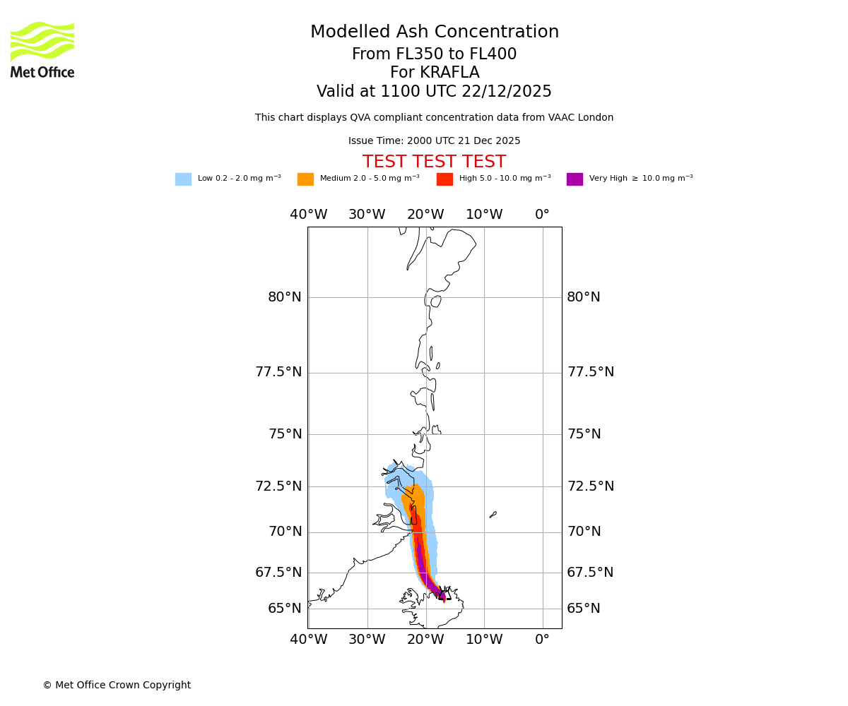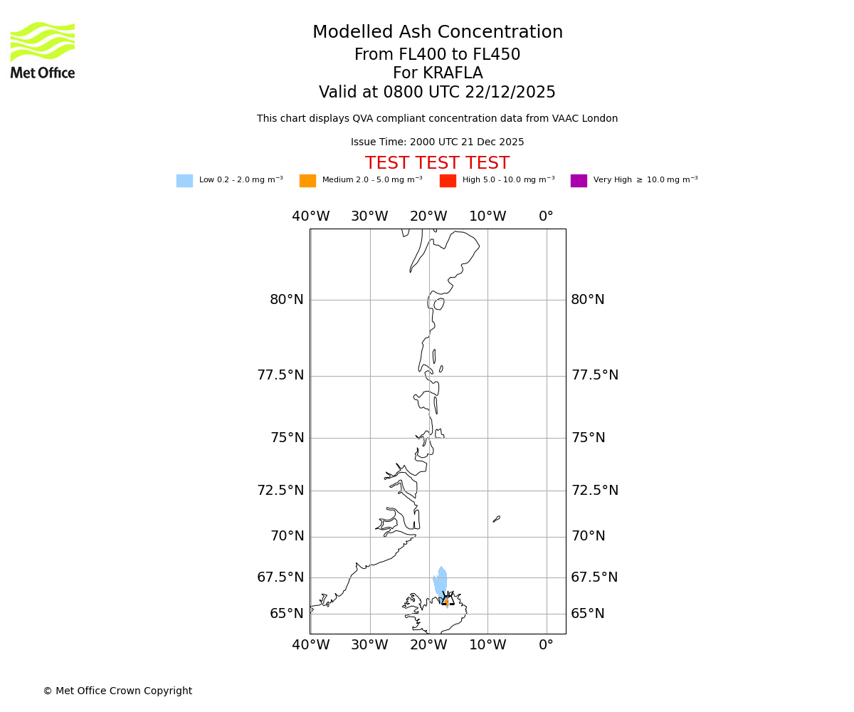 Modelled ash concentration from 350 to 400 for KRAFLA. Valid at 0800 UTC 22/12/2025