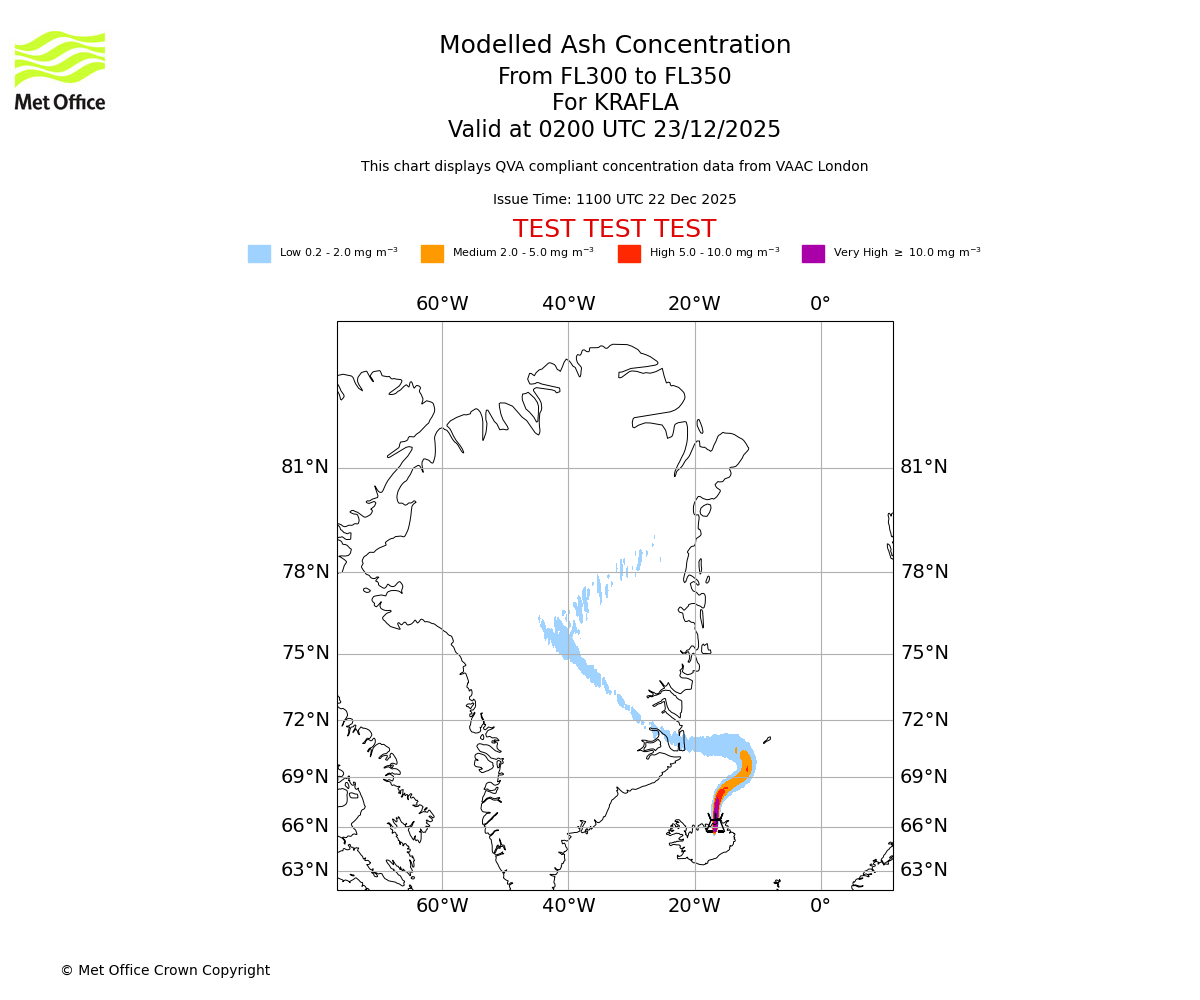 Modelled ash concentration from 000 to 200 for KRAFLA. Valid at 1100 UTC 22/12/2025