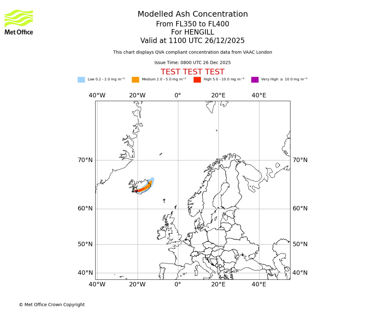 Modelled ash concentration from 350 to 400 for HENGILL. Valid at 0800 UTC 26/12/2025
