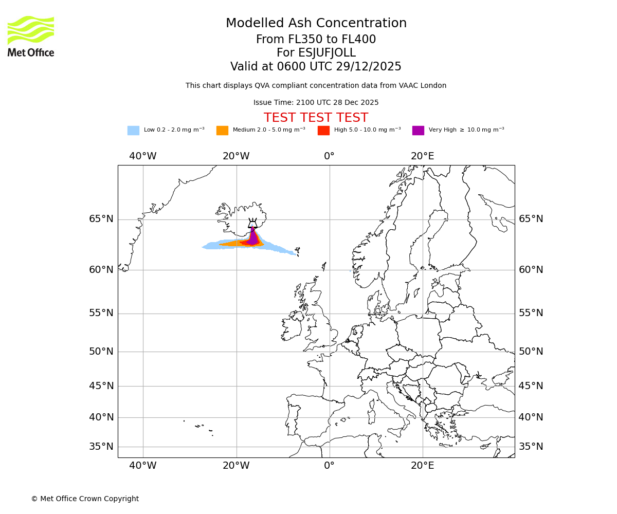 Modelled ash concentration from 350 to 400 for ESJUFJOLL. Valid at 0300 UTC 29/12/2025