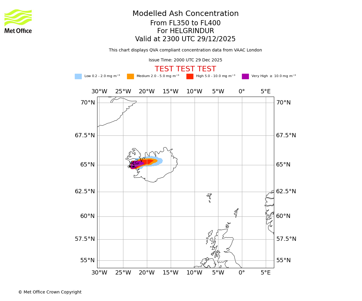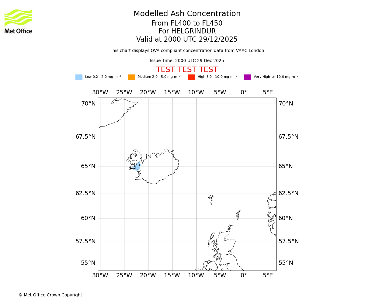 Modelled ash concentration from 350 to 400 for HELGRINDUR. Valid at 2000 UTC 29/12/2025