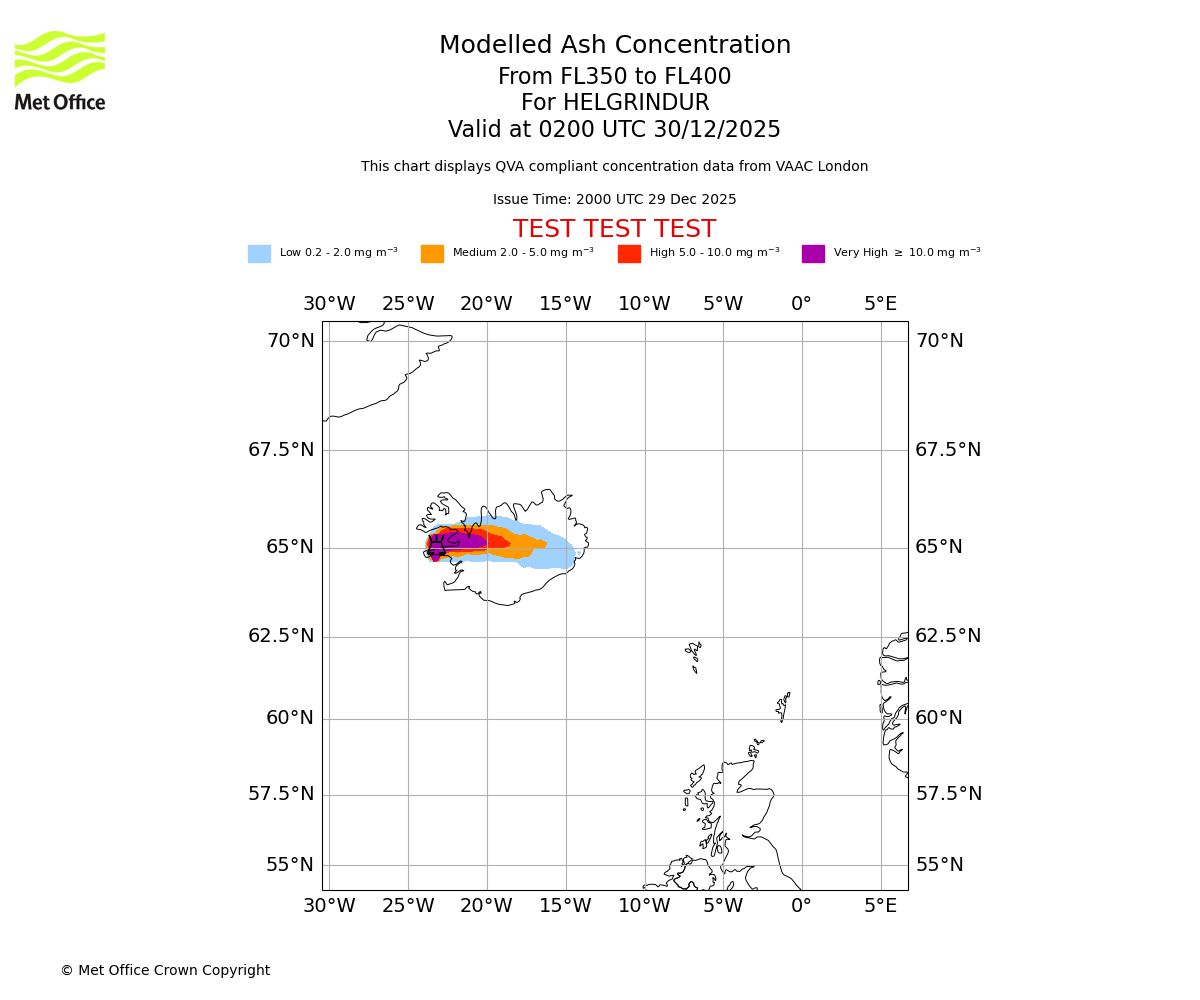 Modelled ash concentration from 350 to 400 for HELGRINDUR. Valid at 2300 UTC 29/12/2025