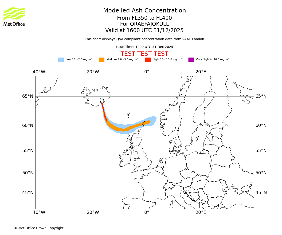 Modelled ash concentration from 350 to 400 for ORAEFAJOKULL. Valid at 1300 UTC 31/12/2025