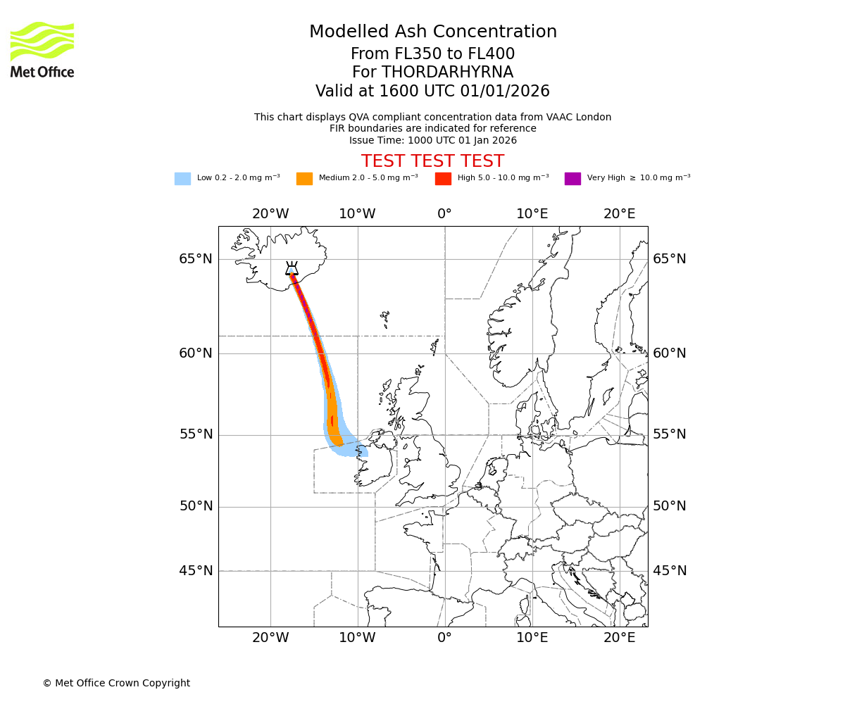 Modelled ash concentration from 350 to 400 for THORDARHYRNA. Valid at 1300 UTC 01/01/2026