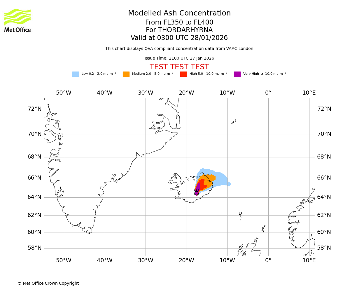 Modelled ash concentration from 350 to 400 for THORDARHYRNA. Valid at 0000 UTC 28/01/2026