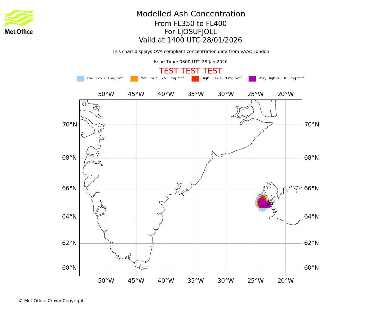 Modelled ash concentration from 350 to 400 for LJOSUFJOLL. Valid at 1100 UTC 28/01/2026