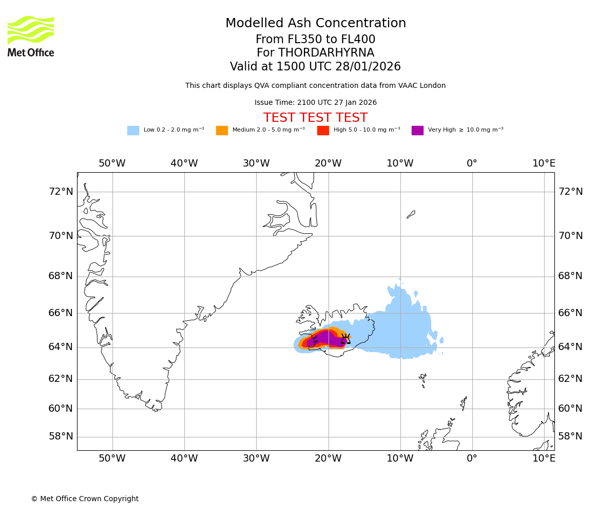 Modelled ash concentration from 350 to 400 for THORDARHYRNA. Valid at 1200 UTC 28/01/2026