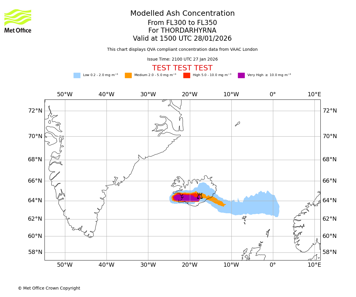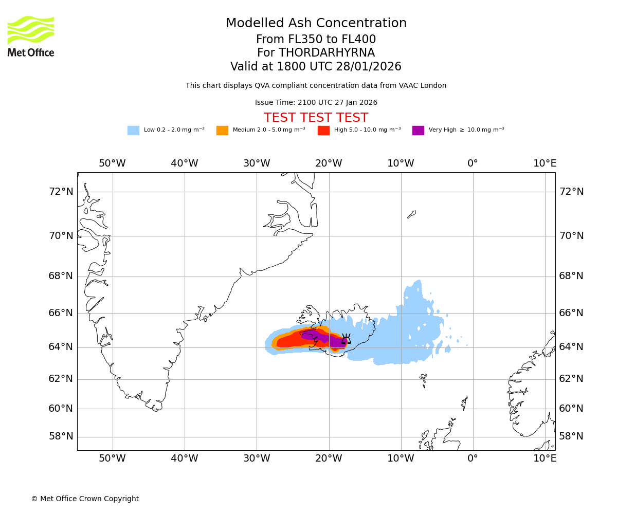 Modelled ash concentration from 350 to 400 for THORDARHYRNA. Valid at 1500 UTC 28/01/2026