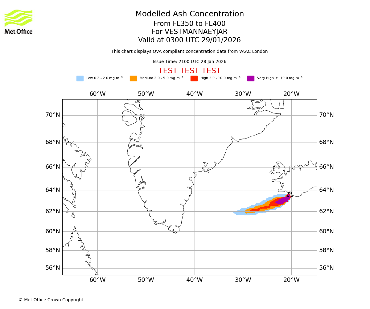 Modelled ash concentration from 350 to 400 for VESTMANNAEYJAR. Valid at 0000 UTC 29/01/2026
