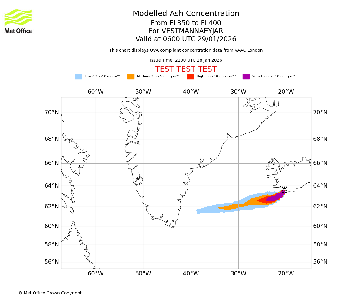 Modelled ash concentration from 350 to 400 for VESTMANNAEYJAR. Valid at 0300 UTC 29/01/2026