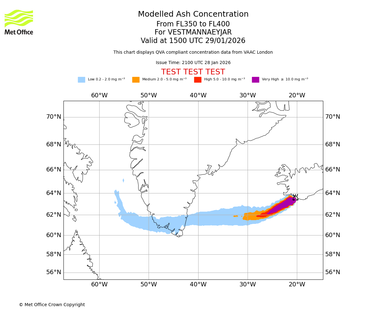 Modelled ash concentration from 350 to 400 for VESTMANNAEYJAR. Valid at 1200 UTC 29/01/2026