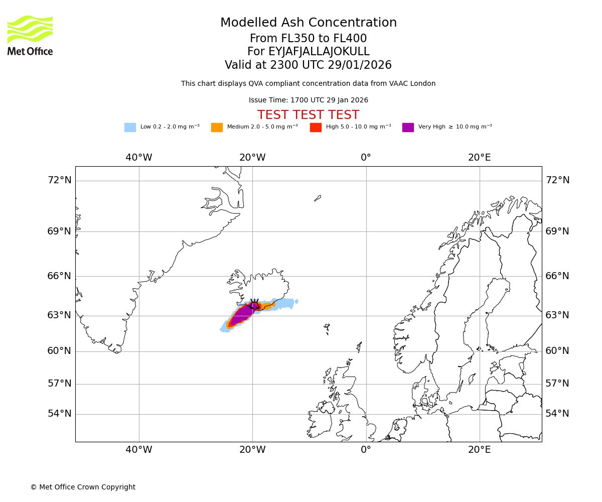 Modelled ash concentration from 350 to 400 for EYJAFJALLAJOKULL. Valid at 2000 UTC 29/01/2026