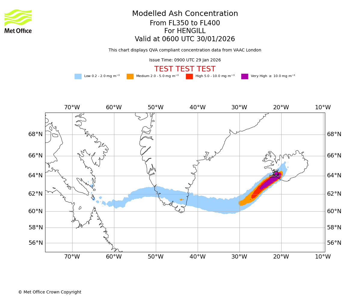 Modelled ash concentration from 350 to 400 for HENGILL. Valid at 0300 UTC 30/01/2026