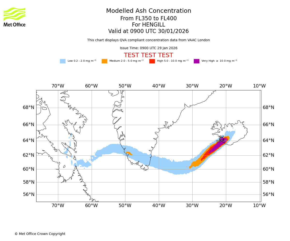 Modelled ash concentration from 350 to 400 for HENGILL. Valid at 0600 UTC 30/01/2026